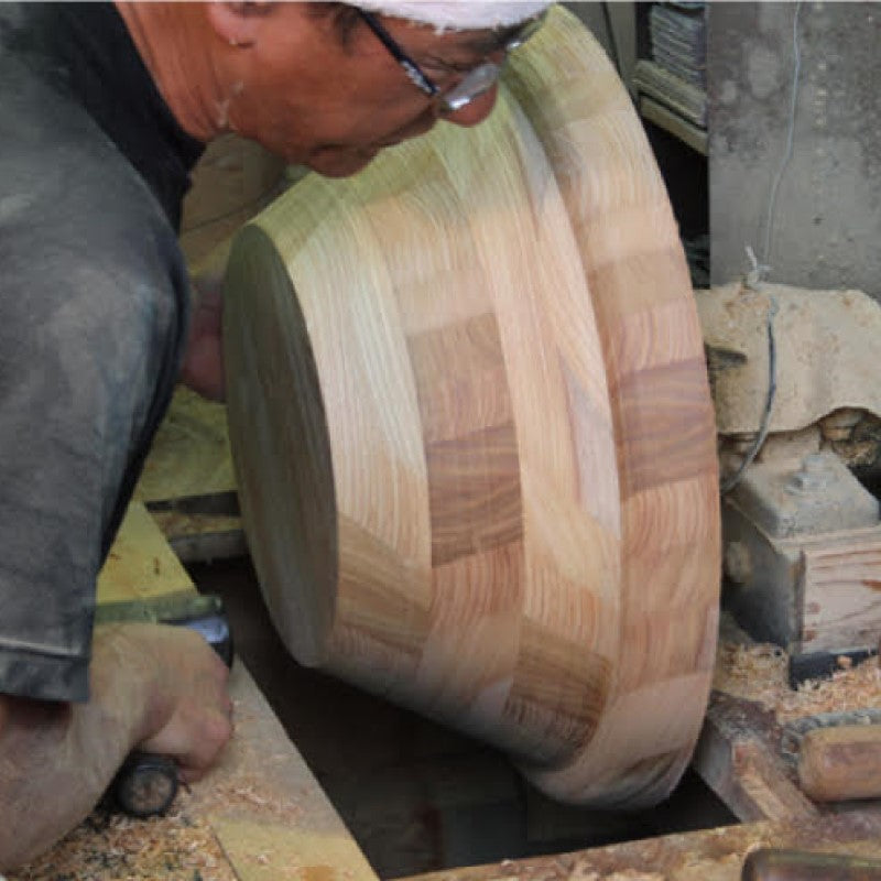 平安時代より伝承される寄木造りの「木地挽き」技法は、材料を独自の接着技術で繋ぎ合わせ、轆轤(ロクロ)で挽く技法です。隙間のない堅牢な作りが特徴で、実用性の高い器に仕上がります。